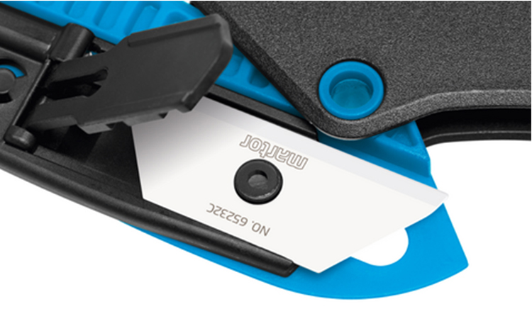 無(wú)需額外工具便可更換刀片,且完全無(wú)需拆卸。相反:按下刀片更換按鈕并完全翻開(kāi)藍(lán)色壓桿,即可更換刀片。