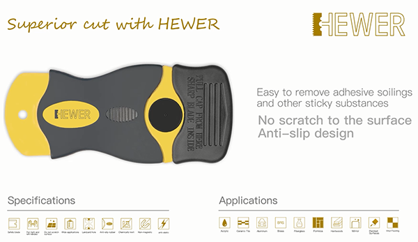 HEWER安全刮刀,既不會刮傷原來的物品,又能輕松去掉黏膠垢以及機器污垢等污漬;這款刮刀還可以輕松去除貼紙以及不干膠,而且還非常安全,不會刮傷自己,非常適合生活或者工作當(dāng)中使用。